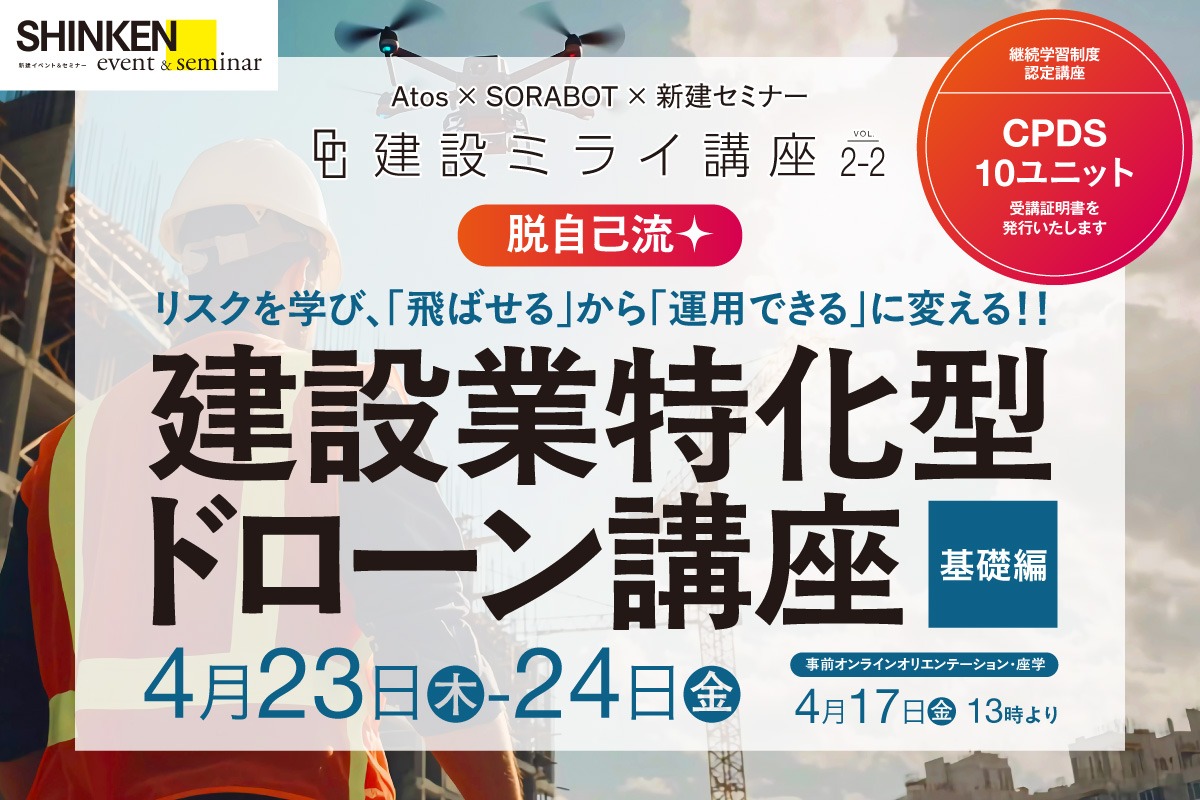 Atos × SORABOT × 新建セミナー 脱自己流★ 建設業特化型ドローン講座 基礎編 ―リスクを学び、「飛ばせる」から「運用できる」に変える― 認定学習講座 CPDS 10ユニット(……