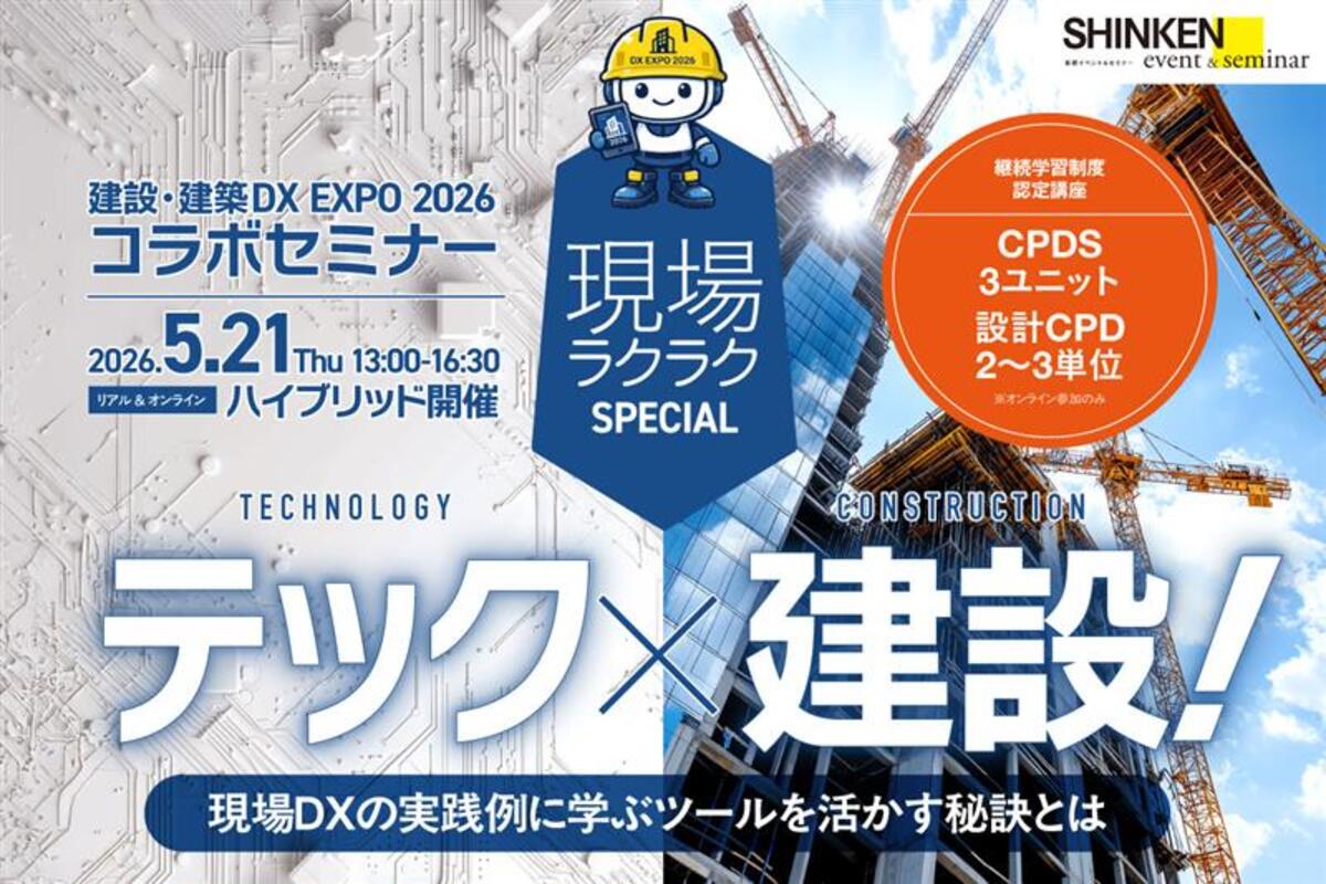 満足度89%超え*のオンラインセミナー *当社アンケートによる 現場ラクラク!スペシャルセミナー建設・建築DX EXPO2026 ~テック×建設!現場DXの実践例に学ぶツールを活かす秘訣とは~ ◆当日はインテックス大阪にて「産業DXエキスポ 建設・建築DX EXPO」特設ブースにて聴講できます◆※先着順・無料 ……
