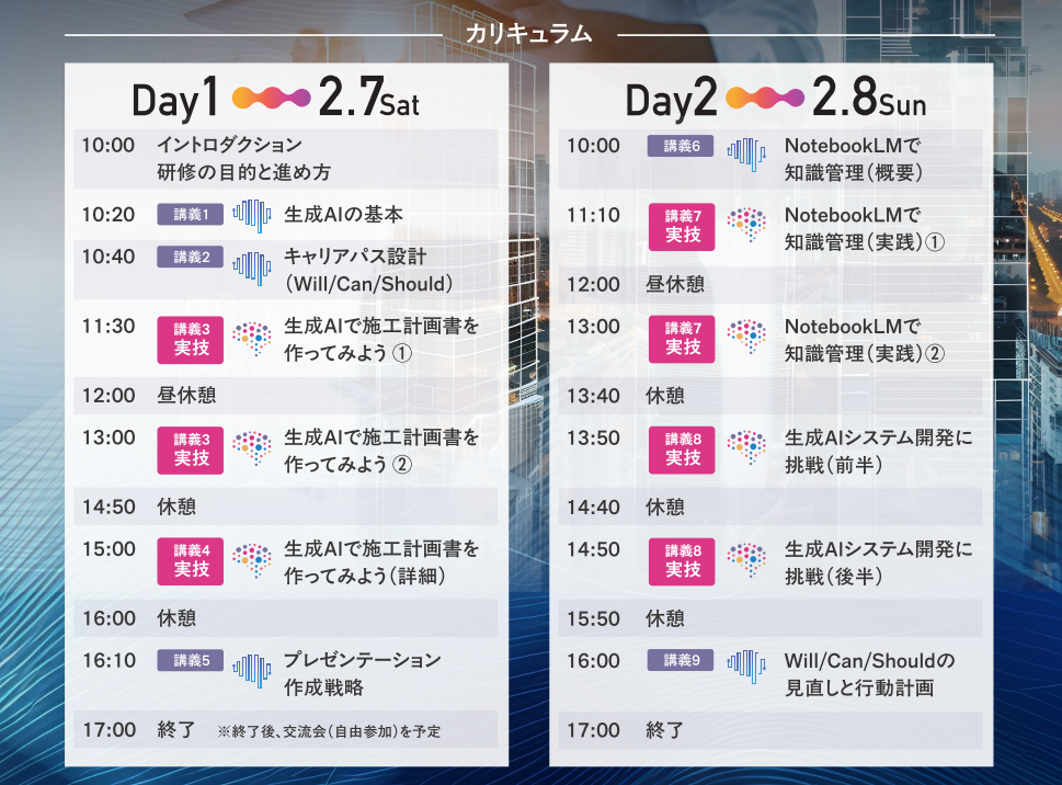 この講習では2日間、建設特化型の生成AI実践スキルを集中的に学び、翌日から即戦力として現場で活かせます。AIの基本的な仕組みから、無料で使える最新の生成AIツールを活用し、施工計画書やプレゼン資料の作成を自動化・効率化するスキルを短期間で習得できる「超実践型プログラム」となります。